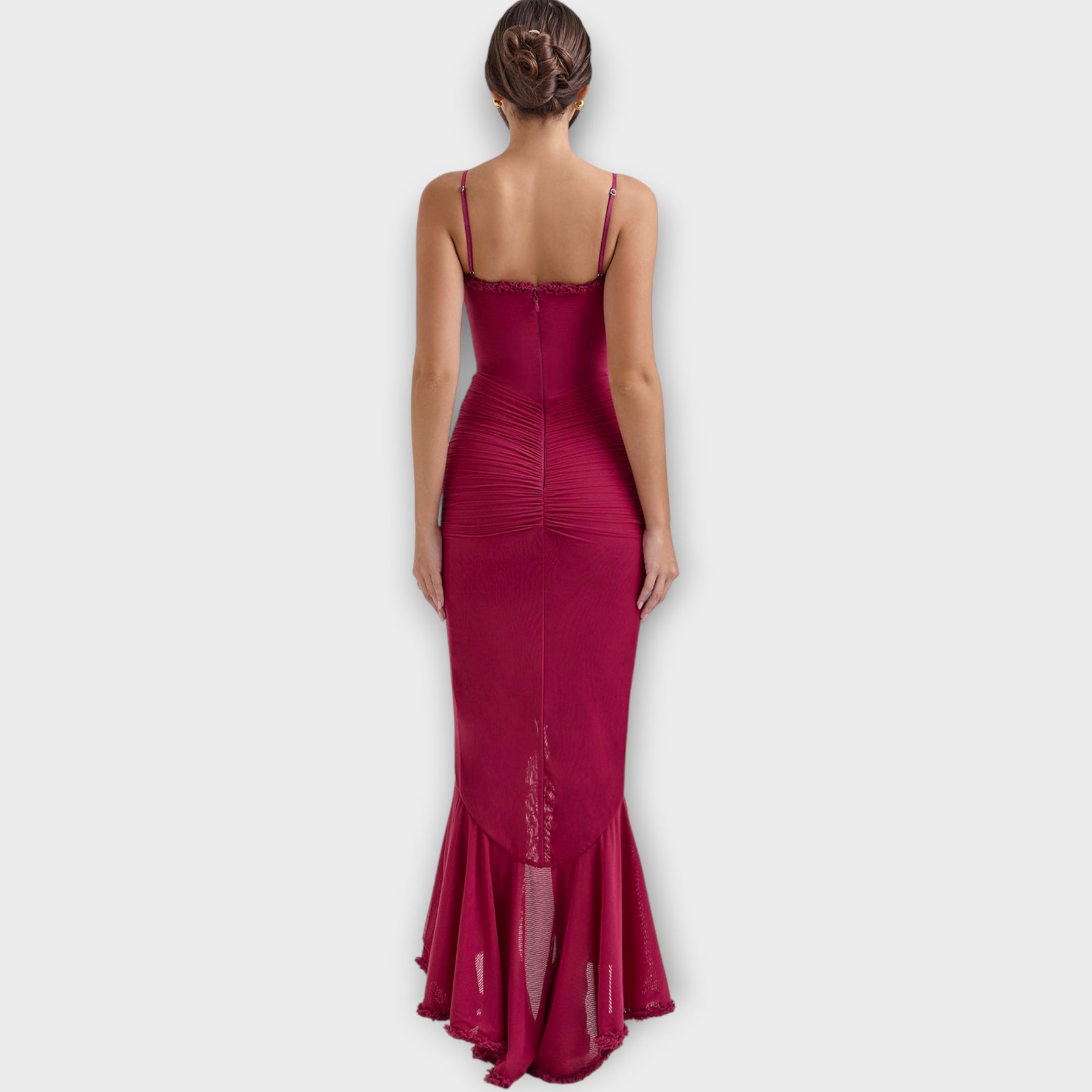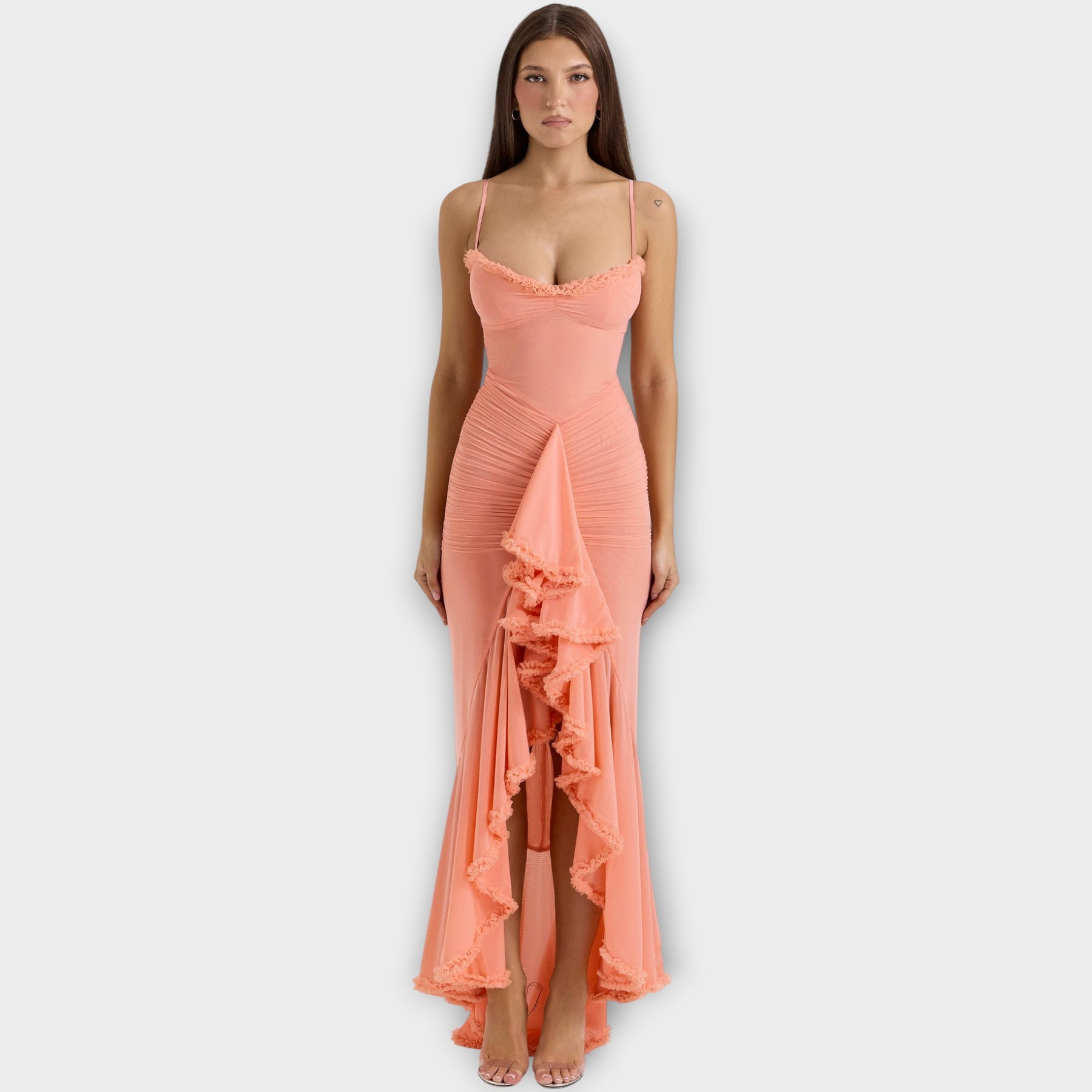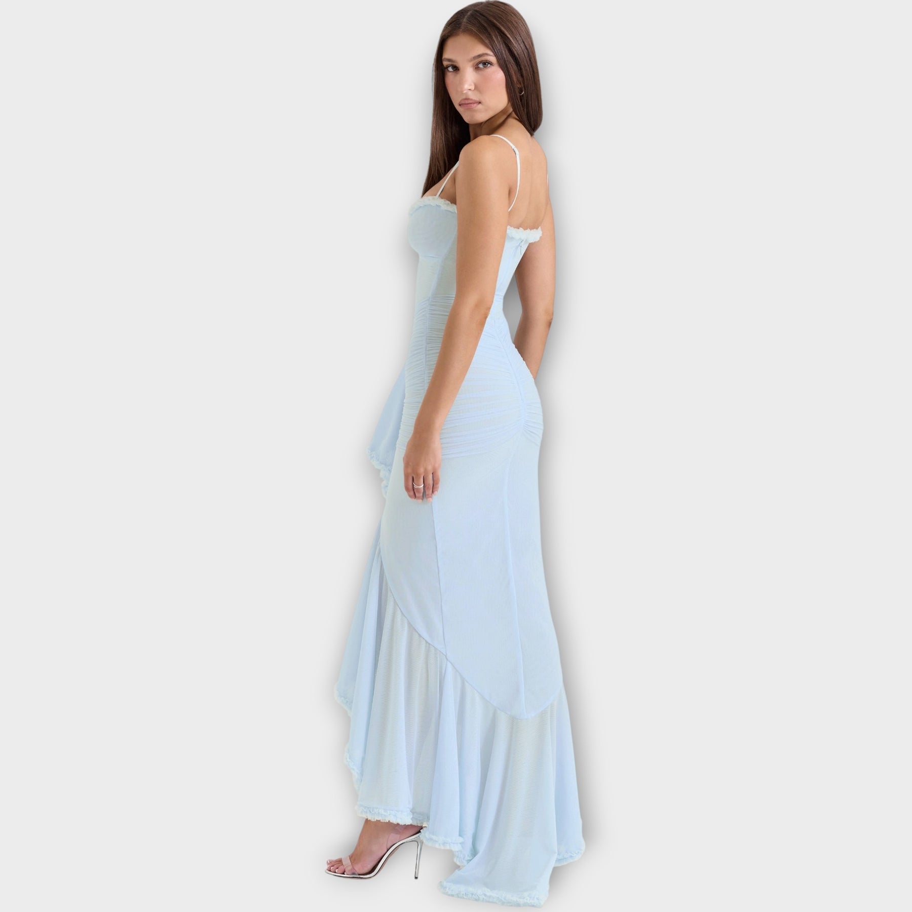 Make a striking entrance in this captivating evening gown designed to sculpt and flatter your silhouette. With a luxurious draped finish and dramatic cascading ruffles, it brings refined glamour to every special occasion.