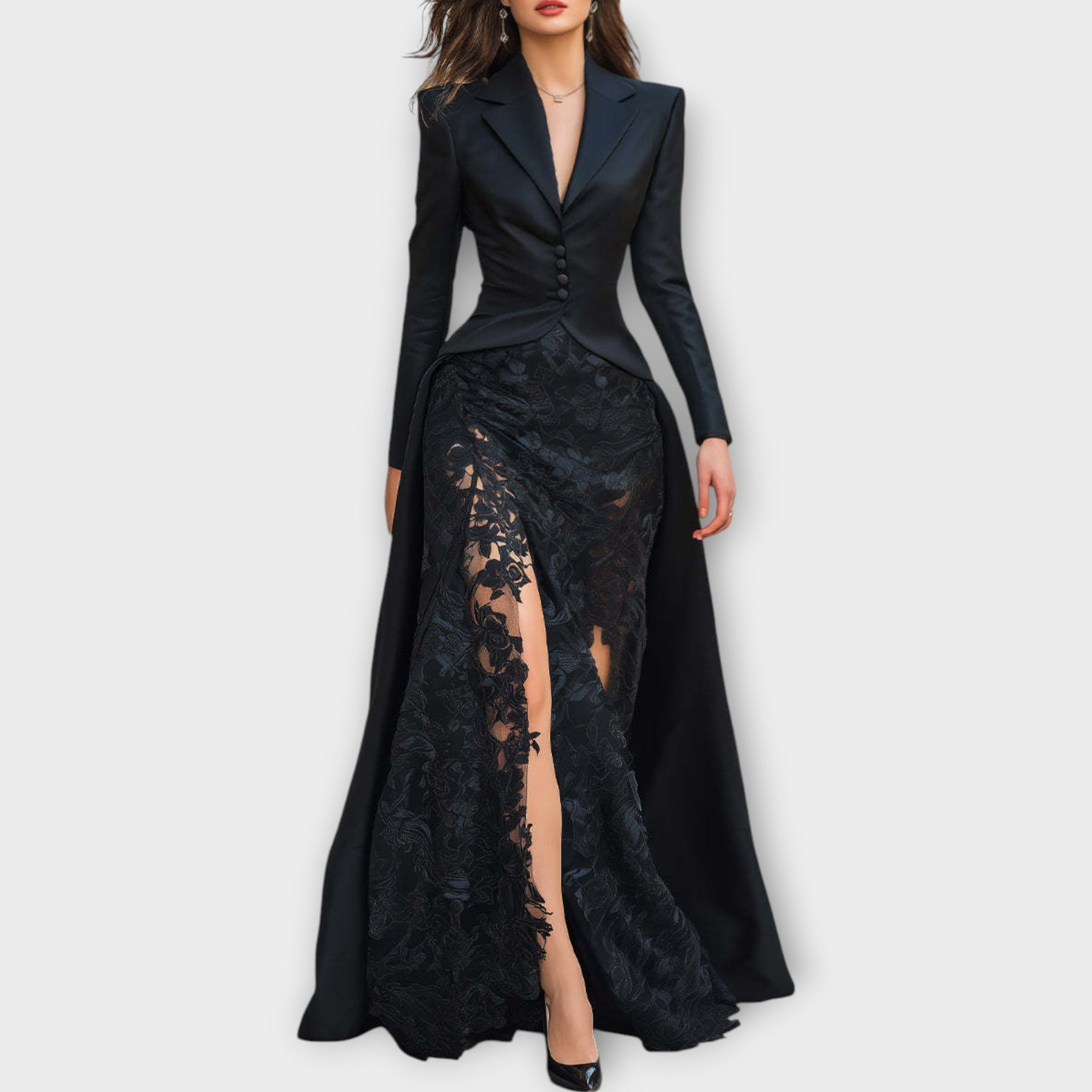 Command attention in the Luxe Satin Lace Gown, a masterpiece of sophistication and allure. Designed to sculpt your silhouette while exuding effortless grace, this gown blends classic tailoring with romantic lace detailing for an unforgettable look.