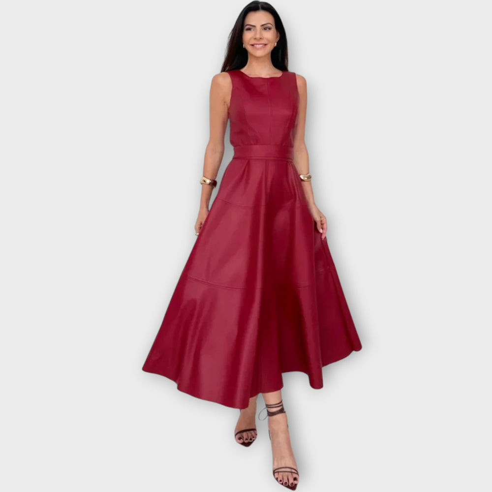 Discover the timeless charm of the midi dress in faux leather, perfect for those seeking a refined and modern look. With its sleeveless design, round neckline, and tailored fit, this dress emphasizes the silhouette with class and femininity.
