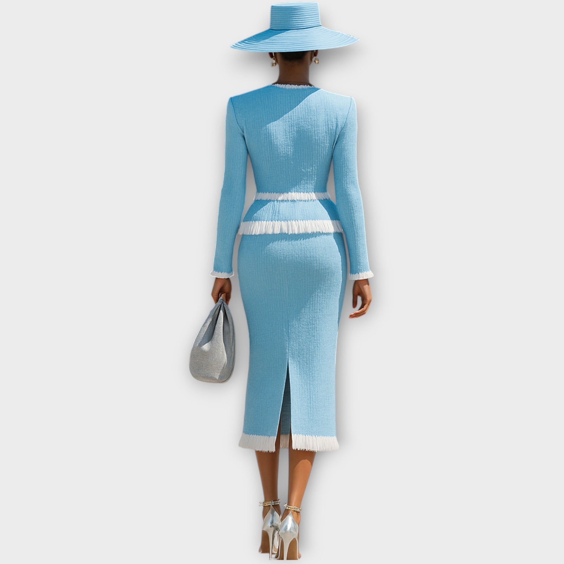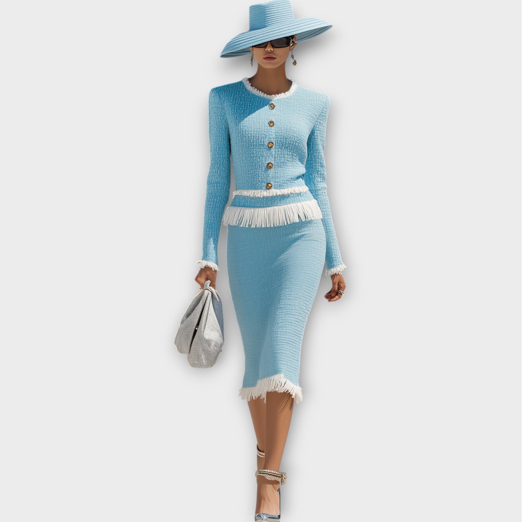 This refined two-piece skirt set blends luxury and sophistication with its tailored silhouette and chic fringe accents. Designed to make a statement, it offers timeless elegance perfect for upscale events, business occasions, or high-class outings.