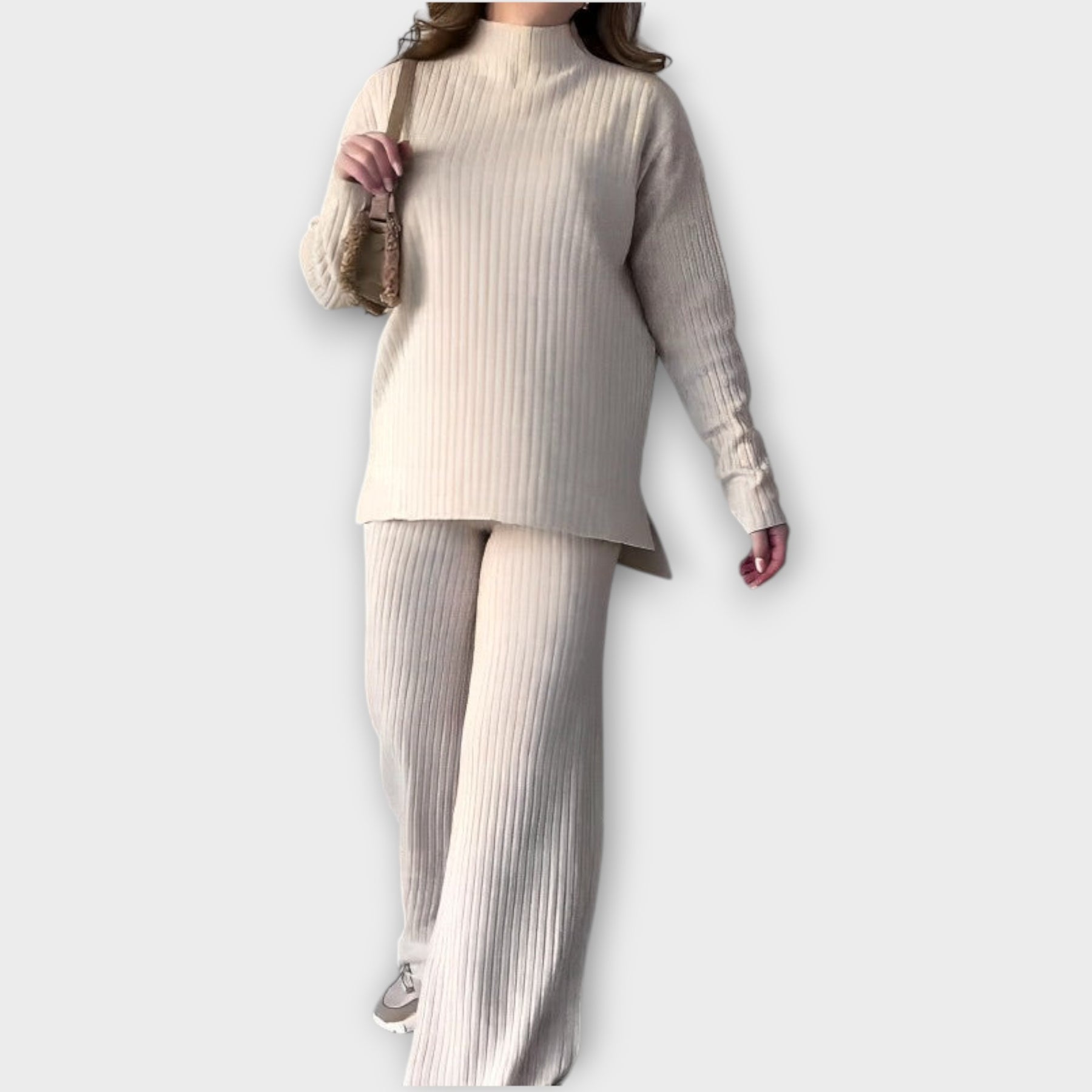 Meet your new go-to set for effortless comfort and chic style. This ribbed knit two-piece features a relaxed high-neck sweater and matching wide-leg pants that move with you. Designed for cozy days and elevated everyday outfits, it brings a perfect blend of softness, stretch, and sophistication.