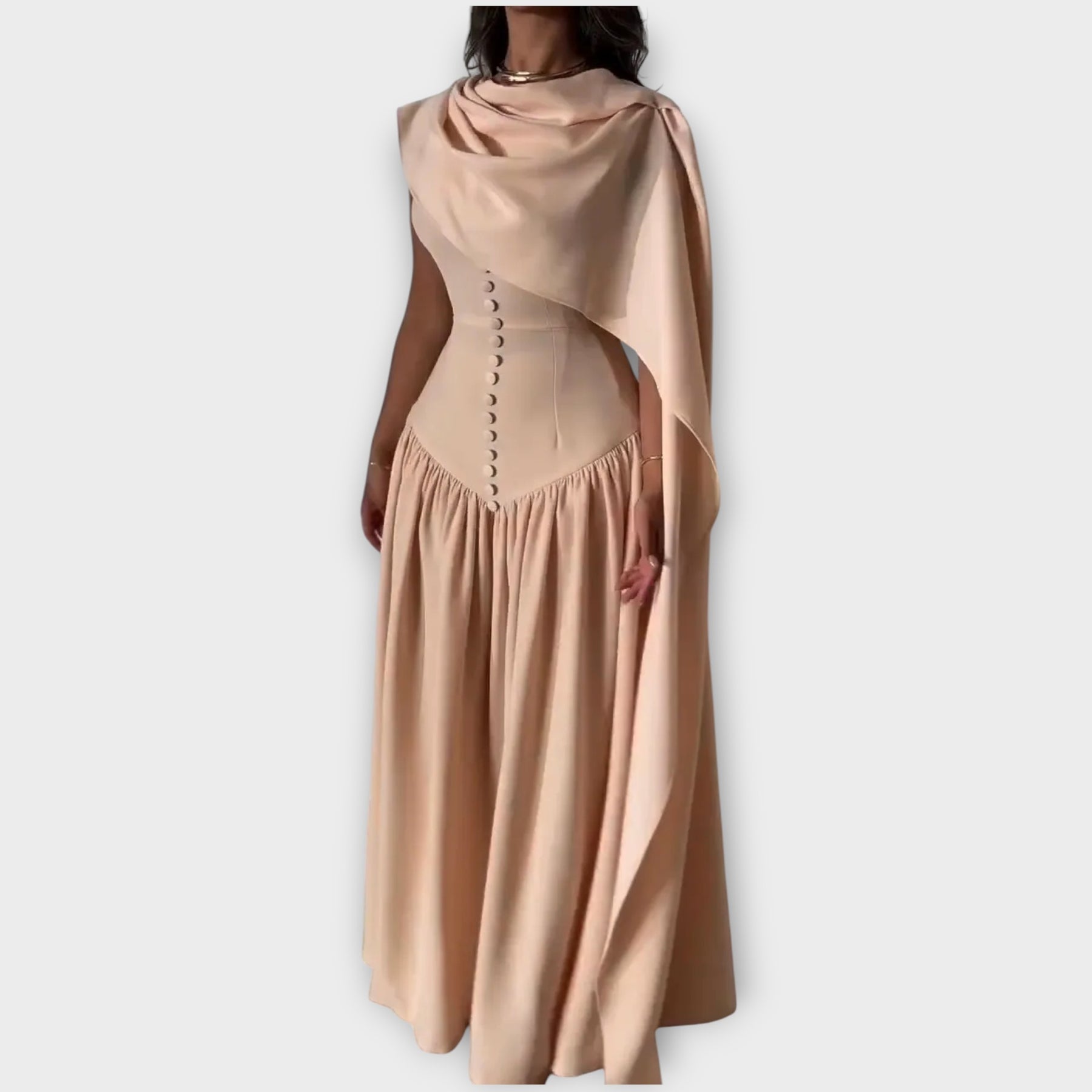 Step into timeless sophistication with this Grecian-inspired maxi dress featuring a beautifully draped neckline and sculpted waist. Designed to flatter your silhouette with soft flowing fabric and exquisite button detailing, this piece brings effortless luxury to any formal occasion.