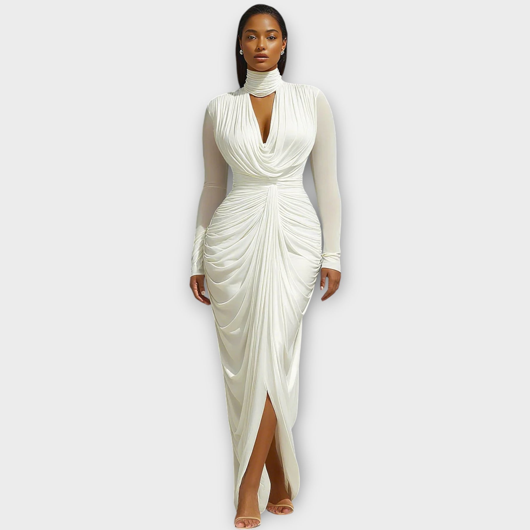 Make a breathtaking entrance in this flawlessly draped evening gown designed to accentuate your curves with timeless sophistication. Its dramatic silhouette and luxurious details make it perfect for galas, formal events, or unforgettable nights out.
