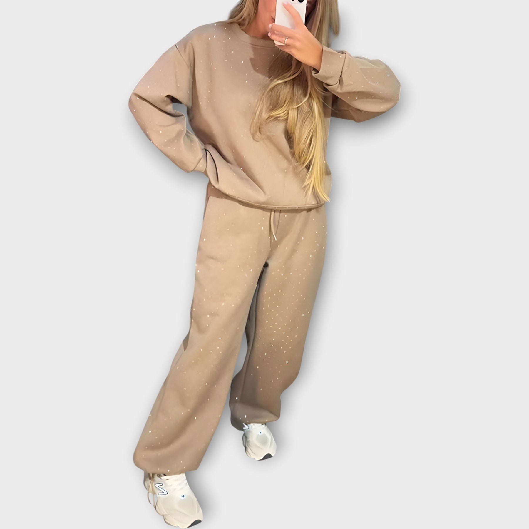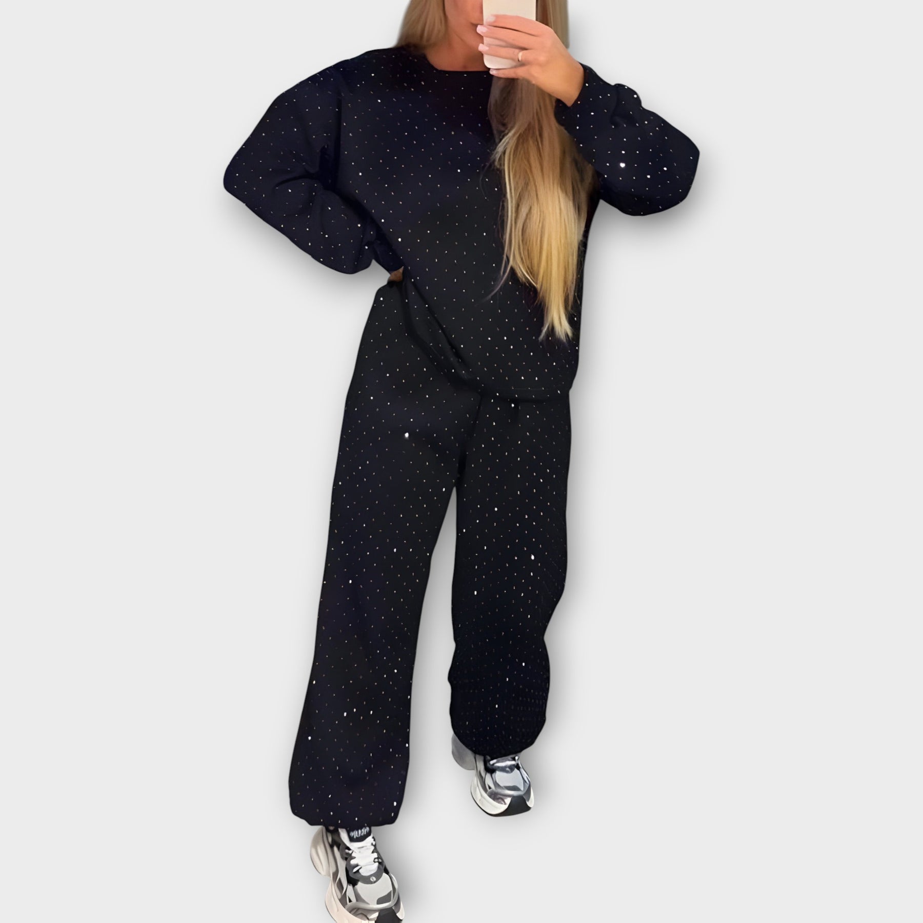 The Chic  Rhinestone Lounge Set brings effortless sparkle to your casual wardrobe. This two-piece ensemble features a relaxed-fit sweatshirt and matching wide-leg pants, both adorned with subtle shimmering rhinestones that catch the light beautifully.